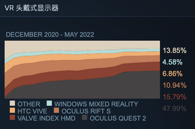 不过好景不长,Steam数据显示,进入今年以来,Oculus Quest 2 用户占比在今年1月从39%跃升至46%后,到今年5月仅上涨了2%,且4、5两月用户量持平,几乎没有增长。