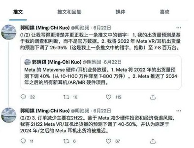 6月22日,天风国际证券分析师郭明錤在推特上表示,Meta的元宇宙硬件头戴设备业务放缓,出货量预测下调40%,同时推迟了2024年之后的所有新耳机/AR/MR硬件项目。
