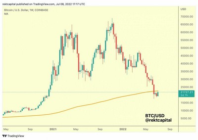 比特币的价格已接近 200 周的简单移动平均线,目前接近 22,570 美元。 尽管采取了这一令人鼓舞的举措,但交易员 Rekt Capital 最近几天对上涨幅度进行了细微调整。