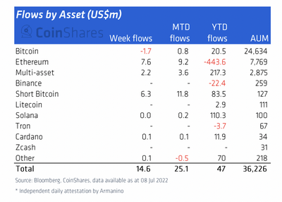 净美元流入/流出基于加密的基金(按资产)。 资料来源:CoinShares/彭博社