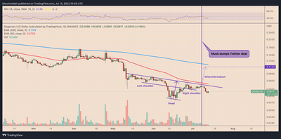 在马斯克于 7 月 8 日取消与 Twitter 的交易后,狗狗币下跌了 19.5%。这样做,DOGE 还取消了其盛行的“反向头肩 (IH&S)”模式,该模式可能将其每个代币的价格推高至 0.112 美元,如下所示。