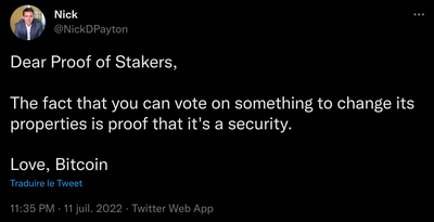 “此外,还有一点语法上的细微差别:在英语中,当我们谈论权益证明之类的事情时,我们不会说“它是一种证券”,而是说“它是安全的”。 我知道这些后缀很棘手,所以我原谅这个错误。 »
