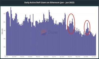 它指出,DeFi 的日活跃用户数量在第二季度仅从 50,000 下跌到 30,000 的 34.5%,此外还有多个实例导致 DeFi 活动大幅上涨。