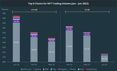 该报告还发现,不可替代代币(NFT)的交易量较 2021 年 6 月的峰值下跌了 26.2%,至本季度的 76 亿美元,主要原因是以太坊网络上提供的 NFT 交易量下跌。
