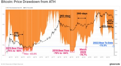 这个熊市现在完全符合历史规范和严重程度,目前的跌幅比 2021 年 11 月的 新高 低 -73.3%,持续时间在 227 到 435 天之间。因此,这是一个历史性的熊市,所有钱包群组的累计损失都创下了新记录。