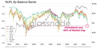 比特币的价格在 2022 年 6 月 18 日跌破20,000 美元的水平,抛售压力导致价格进一步下跌。许多投资者正在亏损,大量比特币供应处于亏损状态。