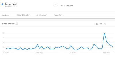 虽然“加密货币”、“以太坊”或“卡尔达诺”等关键词的搜索兴趣是 1 年来最低的,但“比特币死”一词最近的兴趣却飙升。在 6 月 18 日比特币单日下跌-16%的那一天,搜索兴趣达到了最高水平。可以通过假设许多人已经出售他们的加密并且不再关心整个资产类别来解释搜索“Bitcoin Dead”的下跌。