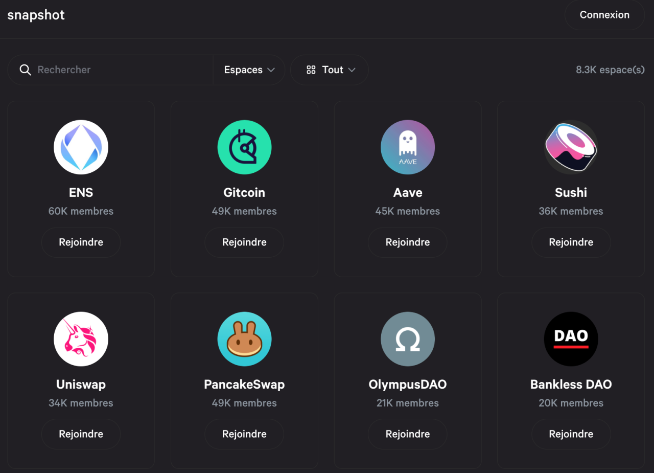 Snapshot 于 2020 年 8 月推出,是监督去中心化自治组织 (DAO) 投票的参考平台。 这托管了超过 8,000 个协议的投票模块。 我们发现了几个著名的区块链,例如 Uniswap、Curve 或 Aave。