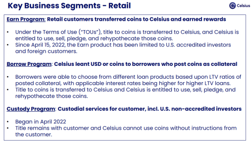 然而,当涉及到Celsius 托管服务时,情况就不尽相同了。服务条款声称,用户仍保留对加密的所有权,Celsius 无法在未经客户同意的情况下使用这些加密货币。