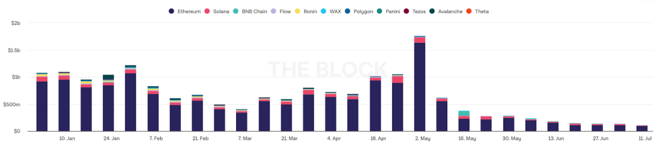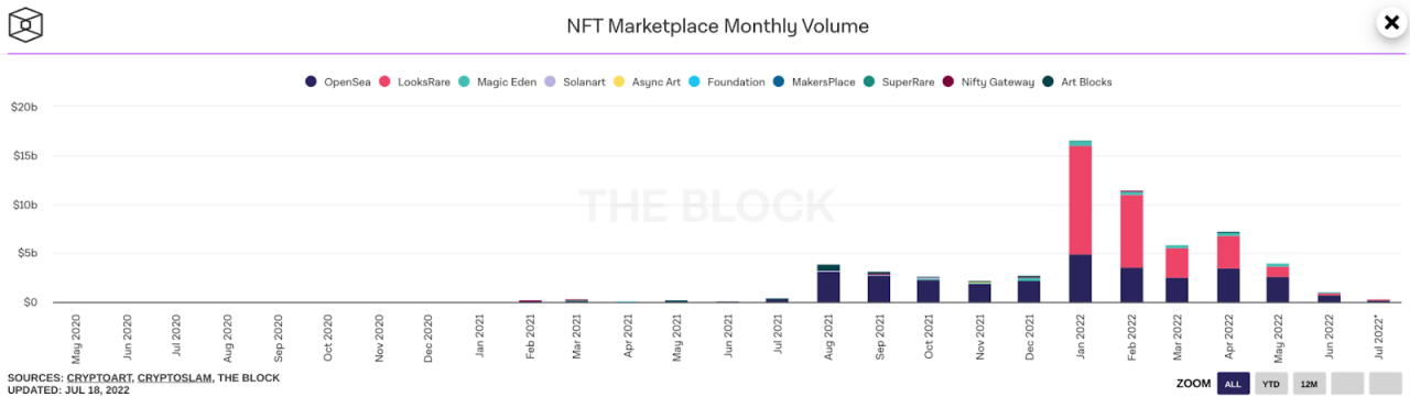 这是 NFT 生态系统中最大的月度环比下跌。 到目前为止,该记录是由 2022 年 2 月至 2022 年 3 月之间的交易量下跌 48% 保持的。