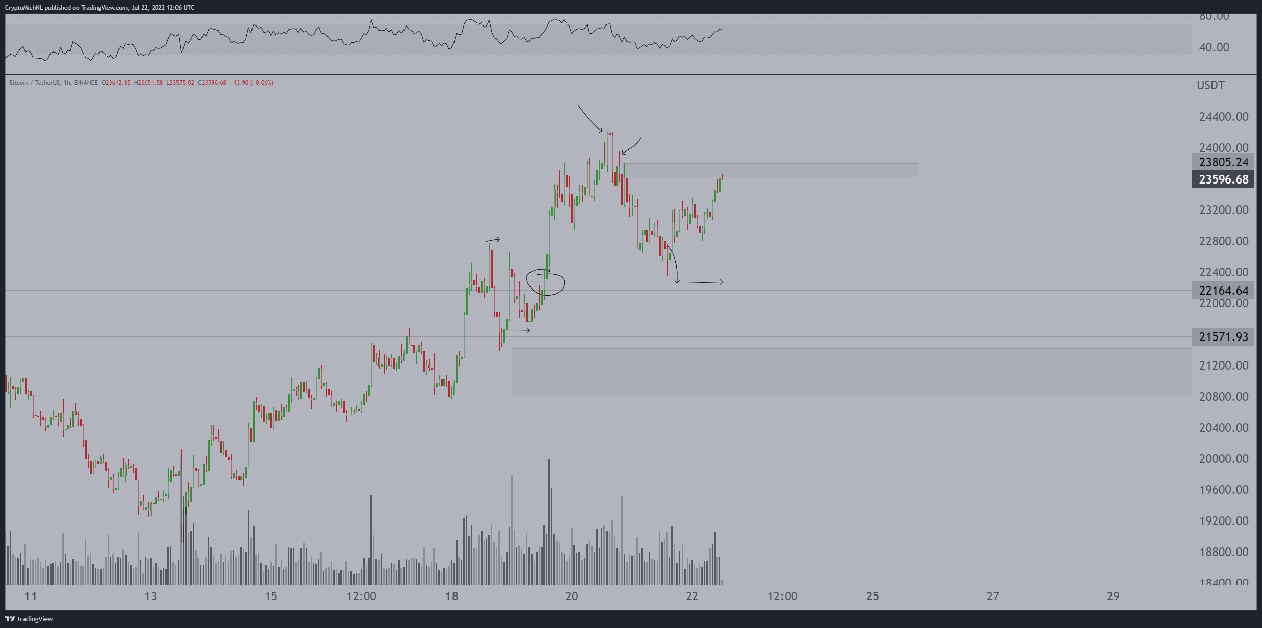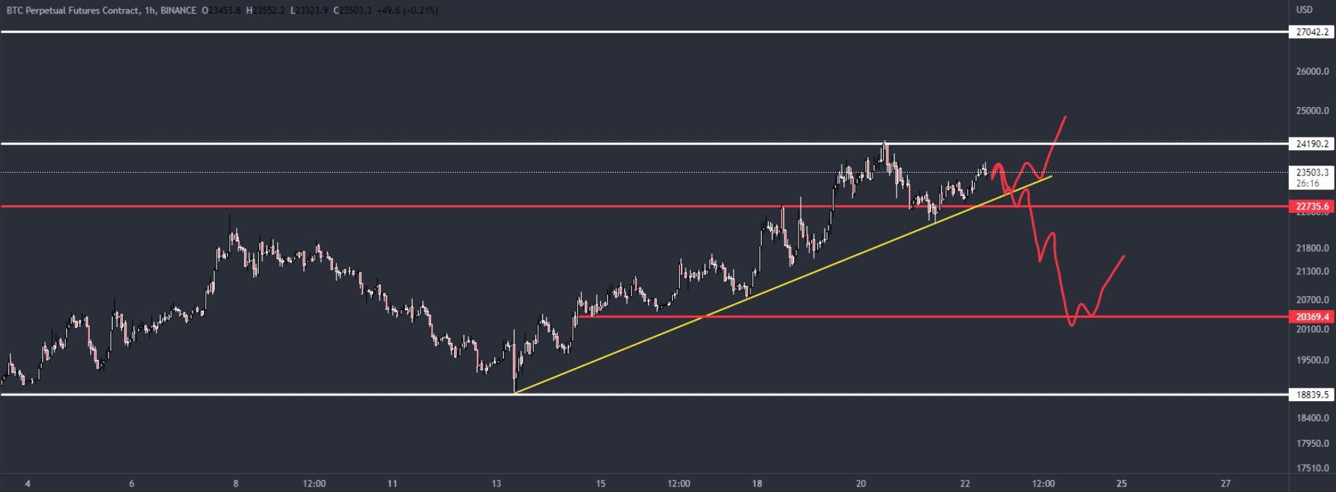 “突破并持有 24,200 美元。 我认为我们很快就挤到了 27K-28K 美元。 如果我们开始接受回到该范围内,我正在寻找低至 2 万美元的同花顺。 两者都很容易失效,保持安全。”