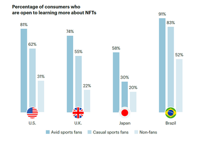 在美国、英国、日本和巴西,58% 的体育迷认为对 NFT 有一定程度的了解。 此外,54%(或 1,755)的受访者认为 NFT 对他们最喜欢的运动产生了积极影响。