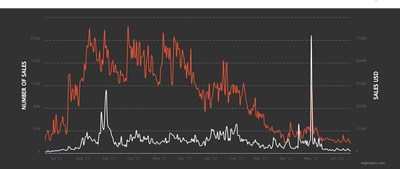 2021 年 6 月至 2022 年 6 月之间的每日 NFT 销售数量。来源:NonFungible