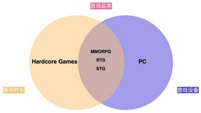 我们用韦恩图对上面的游戏分类进行了交叉归类,并将对它们之间的重叠部分进行用户画像分析。