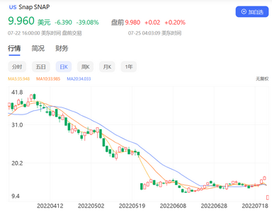2022年7月21日,社交媒体公司Snapchat披露2022年第二季度财报,业绩低于市场预期,公司股价在盘后大跌40%,创2020年3月份以来收盘新低。