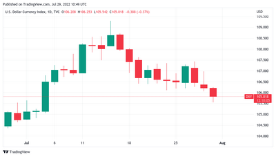 美元指数 (DXY) 当天触及 105.54,为 7 月 5 日以来的最低水平,然后在撰写本文时反弹至 106 附近。