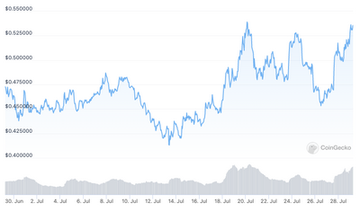 在预期的更新中,卡尔达诺 (ADA) 的价格出现了一些显着波动,在撰写本文时,过去 24 小时内飙升了 7% 以上,交易价格为 0.537 美元。 根据 CoinGecko 的数据,该加密货币在过去 14 天内上涨了 21%。