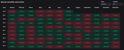 BTC/USD 月度收益K线走势图(截图)。 资料来源:Coinglass