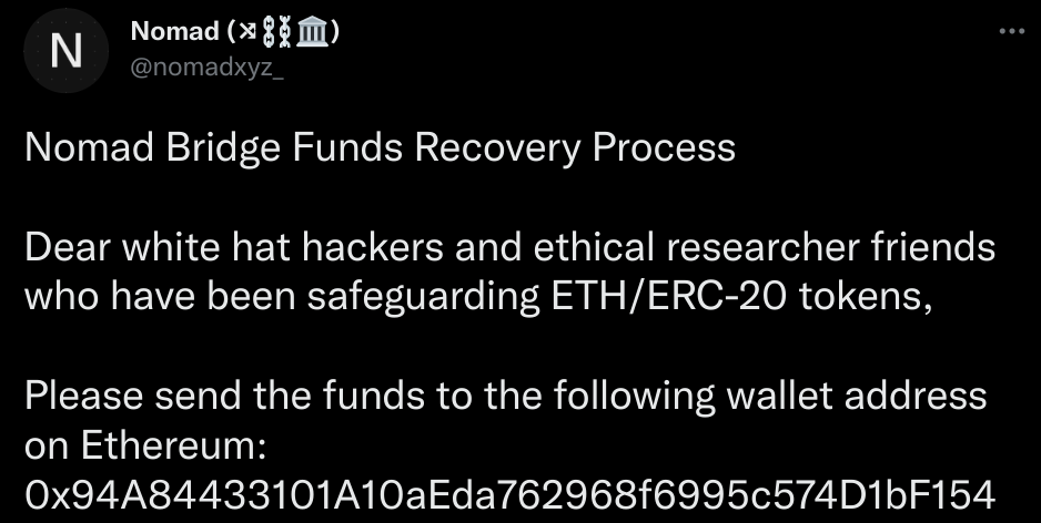 “Nomad Bridge 资金回收流程。 亲爱的黑客和支持 ETH/ERC-20 代币的伦理研究人员。 请将资金发送到以太坊上的以下钱包地址。 »