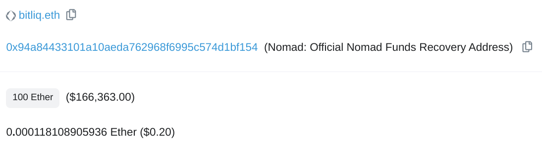 因此,8 月 3 日,ENS bitliq.eth 向 Nomad 设置的官方资金回收地址返还了 100 ETH,即 166,000 美元。 另外两个地址返回了 20 个额外的 ETH。