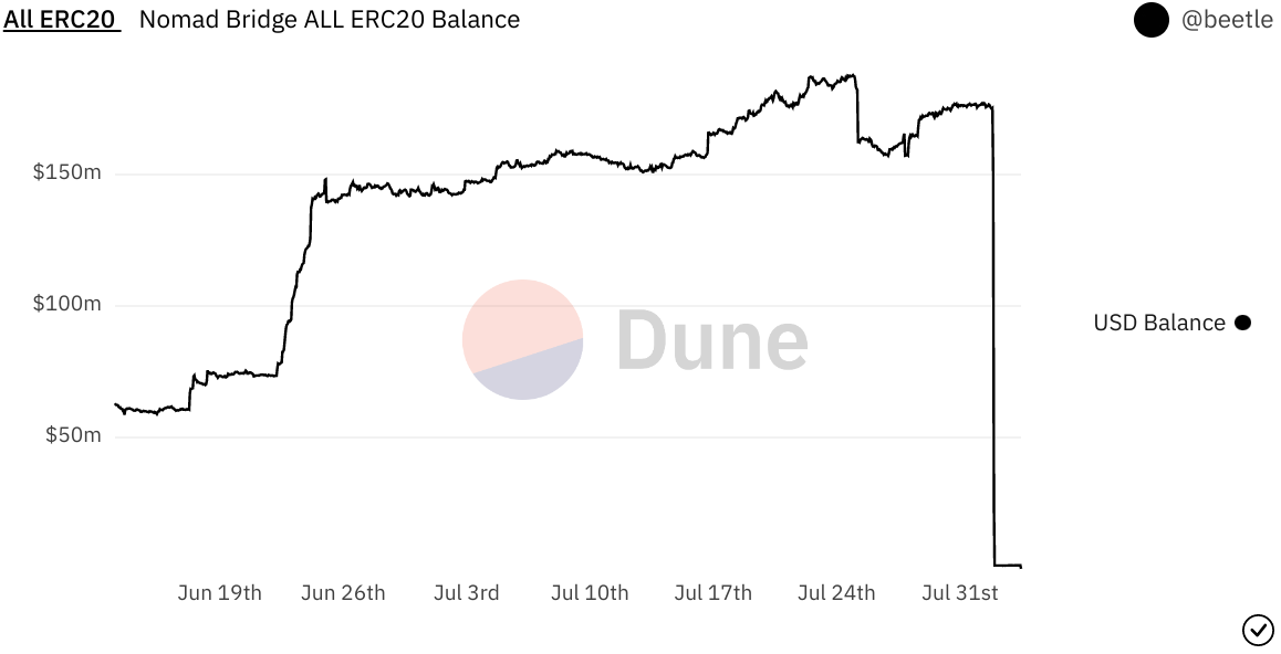 8 月 2 日凌晨,Nomad Bridge 成为攻击目标,导致协议上存放的几乎所有资金丢失。 总共有 1.9 亿美元被 40 多个不同的钱包抽走。
