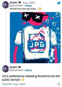 XCOPY 设计的NFT 艺术品与Moonbirds 截然不同——其专长在于数字插图,每幅售价数百万美元。 XCOPY 此前曾宣布将其作品「Right-click and Save As Guy」转为CC0 许可,进入公有领域。据悉,该作品在去年12 月以近710 万美元价格出售。