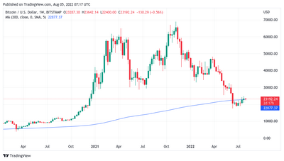 具有 200 周 MA 的 BTC/USD 1 周蜡烛图 (Bitstamp)。 资料来源:TradingView