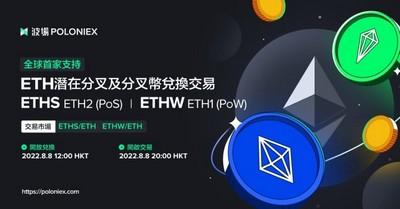 波场Poloniex 8 月4 日发布公告表示,将支持以太坊合并升级及潜在分叉,并将于8 月8 日上线两种潜在分叉代币ETHS(代表完全转换为PoS 共识算法链代币)和ETHW(代表继续沿用PoW 共识算法链代币)及相关交易市场。