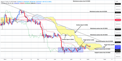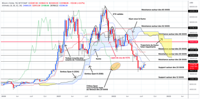 另一个警惕点是关于云下奇骏的进化。 为了分析,自 6 月 27 日那一周以来,它一直停滞在 35,000 美元的阻力位下方。 然而,与 Tenkan 的看跌同步将造成许多投资者不愿做的破坏。 一方面,它可能会损害 6 月中旬以来的技术反弹。 另一方面,它可能会在投降的气氛中造成新的大规模倾倒。 因此,假设以信念威胁著名的 20,000 美元。