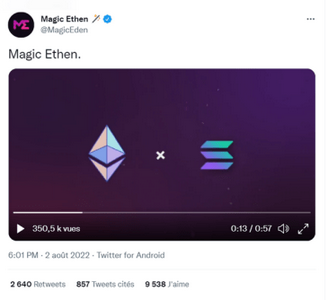Lady and the Tramp – 以太坊和 Solana 现在将在 NFT Magic Eden 交易所和铸币平台上配对。 最近,Solana 上最常用的 NFT 市场通过推特宣布支持以太坊区块链上的 NFT。 在他的公告中添加了一个特殊性,该平台将允许他的两个爱人跨链铸币。 该公司还利用这个机会对 Twitter 进行了轻微的品牌重塑,名为 Magic Ethen。