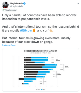 “只有少数几个国家能够将旅游业恢复到疫情之前的水平。 对于国际旅游来说,背后的原因主要是比特币和冲浪。 但国内旅游业增长得更多,主要是因为我们打击了帮派。 »