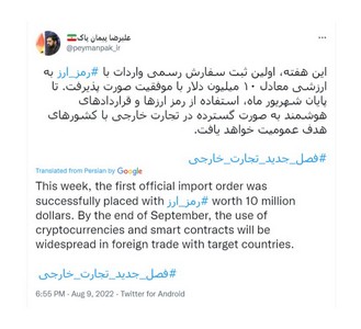 伊朗工业、矿业和贸易部副部长 Alireza Peyman-Pak 在 8 月 9 日的 Twitter 帖子中分享了伊斯兰共和国使用加密货币下达第一笔进口订单的消息。