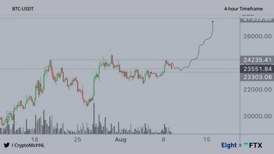 Michaël van de Poppe 认为,如果比特币通过“23-23.2K 美元左右的测试”,目前的趋势将继续下去。 下一个 23,400 美元的“阻力测试”可能会导致“突破 28,000 美元”。