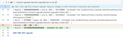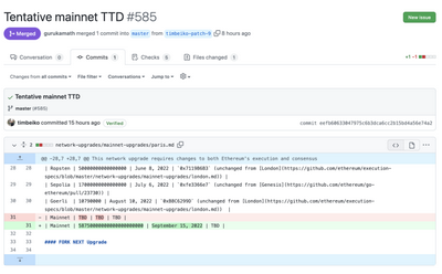 据核心开发者Tim Beiko 发布的内容显示,以太坊主网Bellatrix 分叉Epoch 为144896,时间大概在9 月6 日,当主网Total Terminal Difficulty (TTD) 为58750000000000000000000 时会过渡至PoS 网络,预计于2022 年9 月15 日发生。另一位核心开发者Terence Tsao 也在其推特分享了相关消息,并提到「由于各种不可预期的情况可能会发生,最后一分钟也能出现变化,因此在客户端发布之前没有什么是『最终落实的』。」