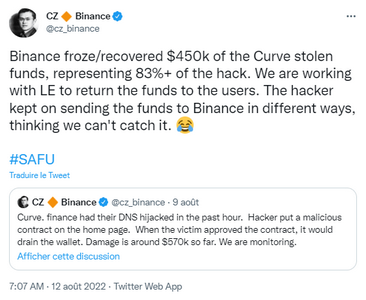 “币安从 Curve 冻结/追回了 450,000 美元的被盗资金,占黑客攻击的 83% 以上。 我们目前正在努力将资金返还给用户。 黑客不断以不同的方式将资金发送给币安,以为我们抓不到他。 »