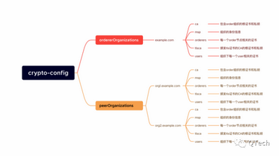 .|-- ordererOrganizations| `-- example.com`-- peerOrganizations |-- org1.example.com `-- org2.example.com5 directories其中每个组织下的目录信息如下: