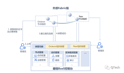 cli: container_name: cli image: hyperledger/fabric-tools:$IMAGE_TAG tty: true stdin_open: true environment: - SYS_CHANNEL=$SYS_CHANNEL - GOPATH=/opt/gopath - CORE_VM_ENDPOINT=unix:///host/var/run/docker.sock #- FABRIC_LOGGING_SPEC=DEBUG - FABRIC_LOGGING_SPEC=INFO - CORE_PEER_ID=cli - CORE_PEER_ADDRESS=peer0.org1.example.com:7051 - CORE_PEER_LOCALMSPID=Org1MSP - CORE_PEER_TLS_ENABLED=true - CORE_PEER_TLS_CERT_FILE=/opt/gopath/src/github.com/hyperledger/fabric/peer/crypto/peerOrganizations/org1.example.com/peers/peer0.org1.example.com/tls/server.crt - CORE_PEER_TLS_KEY_FILE=/opt/gopath/src/github.com/hyperledger/fabric/peer/crypto/peerOrganizations/org1.example.com/peers/peer0.org1.example.com/tls/server.key - CORE_PEER_TLS_ROOTCERT_FILE=/opt/gopath/src/github.com/hyperledger/fabric/peer/crypto/peerOrganizations/org1.example.com/peers/peer0.org1.example.com/tls/ca.crt - CORE_PEER_MSPCONFIGPATH=/opt/gopath/src/github.com/hyperledger/fabric/peer/crypto/peerOrganizations/org1.example.com/users/Admin@org1.example.com/msp working_dir: /opt/gopath/src/github.com/hyperledger/fabric/peer command: /bin/bash volumes: - /var/run/:/host/var/run/ - ./../chaincode/:/opt/gopath/src/github.com/chaincode - ./crypto-config:/opt/gopath/src/github.com/hyperledger/fabric/peer/crypto/ - ./scripts:/opt/gopath/src/github.com/hyperledger/fabric/peer/scripts/ - ./channel-artifacts:/opt/gopath/src/github.com/hyperledger/fabric/peer/channel-artifacts在明确我们需要的证书信息后,我们再通过BaaS进行纳管,趣链BaaS对Fabric的纳管处理如下图所示:
