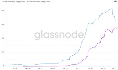 根据glassnode 的数据,在2020 年6 月15 日Compound 带起流动性挖矿的DeFi Summer 时,USDC 的流通量仅有7.3 亿,而USDT 的流通量为91.9 亿,是前者的12.5 倍。一个月后的7 月15 日,USDC 的流通量上涨50% 至11 亿,而USDT 的流通量并没有任何变化。时至今日,USDC 的流通量为555 亿,USDT 为660 亿,已经较为接近。