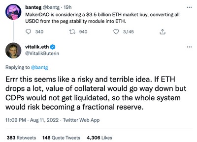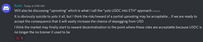 Rune Christensen 还提出了一种非常激进的想法,即用一部分USDC 购买ETH。若ETH 下跌,DAI 的价格可能会低于1 美元。鉴于MakerDAO 会在资不抵债时增发MKR,并通过拍卖进行还贷,此举还会为MKR 引入极大风险。