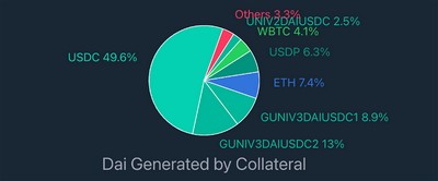 根据Dai Stats 的数据,有49.6% 的DAI 是用USDC 为质押品生成的,如果再加上Uniswap DAI/USDC LP 代币质押品中的USDC,那么这一比例可能达到60%。