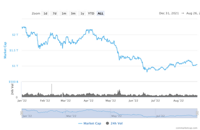 据加密货币价格追踪网站Coinmarketcap统计,年初至今,主流加密货币均遭遇大规模下跌。除了稳定币,市值排名较前的货币跌幅多位于40%-60%区间。加密货币整体市值目前接近1.04万亿美元,相较年初跌去近50%。