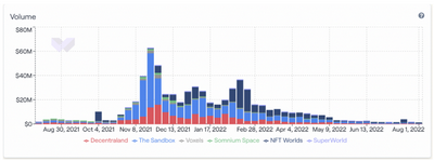同时,由于不利的宏观经济条件,整个加密货币行业整体回落,进一步导致元宇宙平台代币的市场估值下跌超80%。每周平均而言,六大元宇宙项目的土地交易量已从2021年11月的峰值10亿美元降至2022年8月的约1.57亿美元。