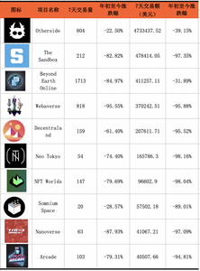 从动辄堪比国内一线城市豪宅的价格,到整个市场无人问津。整个元宇宙项目市场处在熊市中。据NonFungible.com数据显示,截止发稿日期,过去7天交易额排名前十的元宇宙项目中,交易量和交易额相较年初均发生了大幅下跌。
