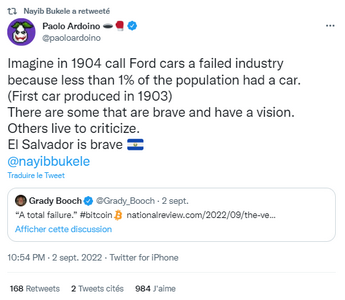 “想象一下,在 1904 年,福特汽车被指定为破产行业,因为当时只有不到 1% 的人口拥有汽车(第一辆福特汽车于 1903 年生产)。 有些人很Brave,有远见。 还有一些人活着批评。 萨尔瓦多很Brave。 »