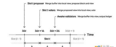 投票缓冲(也称为view merge,最早出现在新的共识协议 Highway 上)。简而言之,缓冲从网络收到的选票,以及在每个验证者的本地视图中精心定时包含这些选票,保证了在具有诚实提议者的slot中,所有诚实的验证者都投票支持提议者的提议。这导致了重组弹性:诚实的提议者的提议保证保留在规范链中。随之而来的是安全性(即输出账本的安全性和活跃性)。