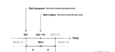 在每个slot的开始,slot的提议者根据前一个 slot 的投票运行简单的 GHOST 分叉选择规则,以确定在哪里提议一个块。进入slot的三分之一时,该时段的委员会成员使用相同的分叉选择规则,该规则基于前一个时段的投票和提议者转发的投票,来确定在哪里投票。 最后,在进入slot的三分之二时,所有验证者都运行一个明确定义的 T 深度确认规则。