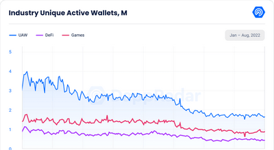 在行业中,游戏占活动使用量的 50% 以上,每日 UAW 为 847,230,但下跌 11%,交易数量环比下跌 12.7%,至 6.98 亿美元。 根据该报告,在 NFT 方面,UAW 下跌 16.7% 至 114,542,这是自 2021 年 6 月以来的最低水平。