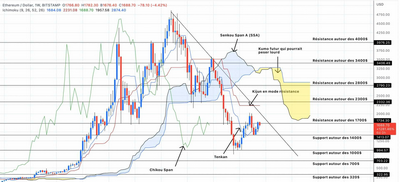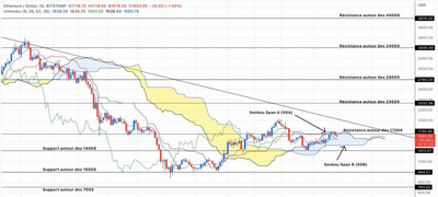 以太坊在 1700 美元以下的犹豫并非偶然。 因为,在每日单位中,它暂时无法摆脱云的上限,即 Senkou Span A (SSA)。 尤其是自从上周日以来,这种不利的技术信号已经获得了动力。 价格绝对没有必要同时突破 Tenkan 和 Kijun,因为担心 1400 美元支撑位的第二次回调不会以图形方式支撑。