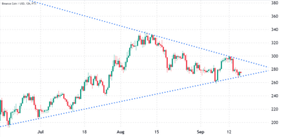 BNB 是币安 BNB 链的原生代币,于 8 月 10 日进入对称三角形形态,当时它首次面临 335 美元阻力位的下跌趋势线。 接下来的五周一直在 280 美元左右挣扎,这是两种相互冲突的上涨和下跌模式之间的确切交点。