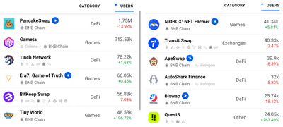 为了确认 BNB Chain 的 TVL 下跌是否伴随着用户的减少,投资者应该分析去中心化应用程序(DApp)的使用指标。 一些 DApp,例如游戏和收藏品,不需要大量存款,因此 TVL 指标在这些情况下无关紧要。